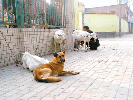 長安區上塔坡村60歲的魏安志養了4只奶山羊,每天早晨,他都在韋曲街頭賣羊奶,而他身邊的黃狗“虎子”護著4只奶羊緊隨其后,“虎子”不僅放羊、看羊,而且還能領著羊兒過馬路,讓老魏省了不少心。