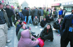 眾多討薪工人坐在小區門前交談。昨日下午,大興區西紅門鎮世嘉博苑小區東門,300余名建筑工人為討薪堵住了該小區大門。記者 孫純霞 攝