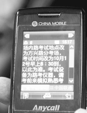 “場(chǎng)地考試點(diǎn)改為方興路分考場(chǎng),請(qǐng)于10月1日至8日早上8:30到考場(chǎng)進(jìn)行場(chǎng)內(nèi)路模擬,合格后方可參加考試。”國(guó)慶節(jié)前夕,很多參加駕駛證直考的考生收到了這樣一條短信,短信后附有考試地址和聯(lián)系電話。