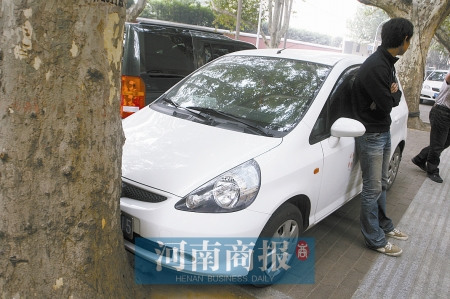 昨天上午10時許,小王從金水路與經五路交叉口往北走,聽見幾個人在爭論。湊過去一看,有輛白色本田車頭緊貼一棵法桐,幾個人正爭論車頭是否挨上了樹。