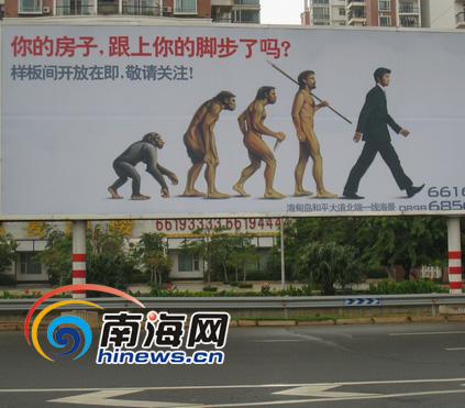 (海南)?诤5閸u某樓盤廣告內容與人類進化掛鉤,看到該廣告的市民都覺得受了莫大的侮辱,認為該廣告有辱公民道德風尚,要求相關部門依法取締并查處。然而記者進一步調查發現,該廣告已通過工商部門審批,核發了許可證,網友直指該廣告低俗。