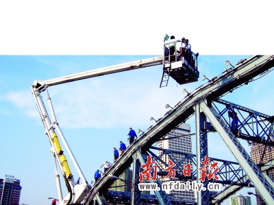 海珠區(qū)警方迅速到場處理。經(jīng)民警勸告,16時30分左右,爬橋人員被勸下(如圖,趙新星攝)。隨后,警方將相關(guān)人員帶回調(diào)查處理,依法對其中兩名組織“跳橋秀”的人員黃某、楊某予以刑事拘留,對王某等14人處以行政拘留處理。(洪奕宜 黃育輝 龔宣)
