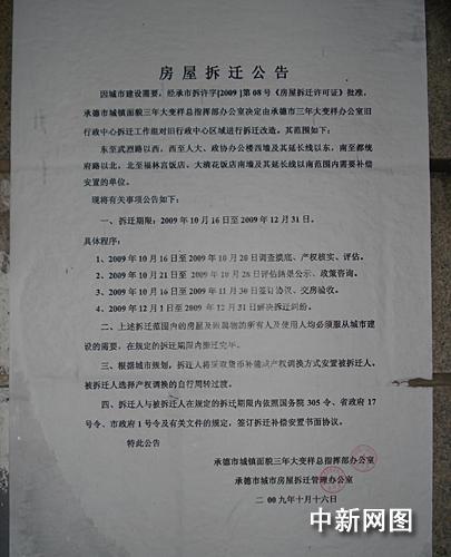 在10月16日由承德市城鎮面貌三年大變樣總指揮部辦公室以及承德市房屋拆遷辦公室印發的《房屋拆遷公告》明確顯示:10月16日至10月20日為老行政中心房屋產權調查摸底、產權核實、評估階段,并由“承德市三年大變樣辦公室舊行政中心拆遷工作組”實施拆遷。而金源公司于10月18日就開始強行拆除皇家安裝工程公司辦公用房。
