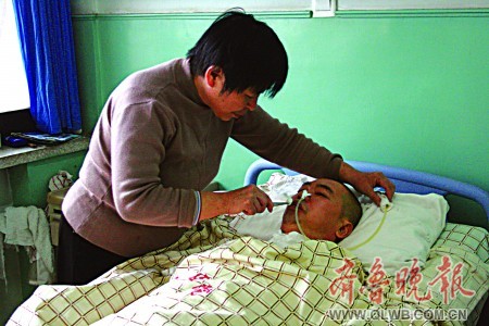 每天一大早,要用濕毛巾給李傳華擦手、擦臉,然后喂他吃飯。她把雞蛋、饅頭或者油餅、油條,以及小米粥,全部摻在一起,用果汁機打碎,用大號的注射器從胃管里打進(jìn)去。每一口飯、一口水的涼熱,她都要先嘗一嘗。
