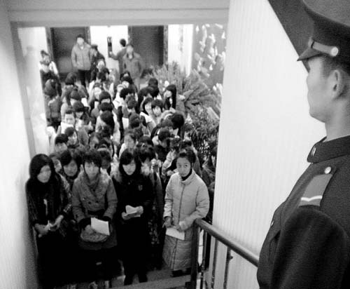 當記者進入鴻翔賓館一樓大廳時,前來報名的女孩和家長們將這里擠得水泄不通。在賓館二樓,沈陽警備區的工作人員正在做著準備工作。“報名開始后,我們將進行分類,在校大學生將走一個門報名,應屆畢業生將走另一個門。”