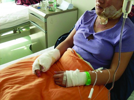 在濱州醫(yī)學院附屬醫(yī)院,記者看到,張青臉上被厚厚的紗布包裹著,有的部位還滲出了組織液,未包扎的耳部已經紅腫出膿,看了讓人揪心,守護在新娘子旁邊的母親不時傷心落淚,新郎也愁眉不展。