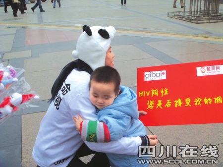 我是“艾滋病毒攜帶者”,能給我一個溫暖的擁抱嗎?昨日,一群打扮成熊貓模樣的年輕人舉著印有“您的擁抱能給我生存的勇氣”的紅色標牌走在春熙路上,他們在擁擠的人群中穿梭,面帶微笑向路人致意。這些人的一舉一動引起了市民強烈好奇,有的人干脆跟在這些年輕人身后看個究竟。