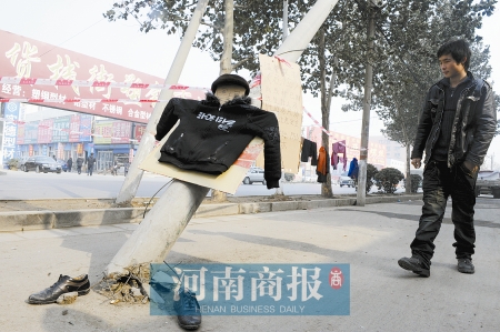 馬路上的這根線桿,不但有鳳凰臺巡防隊掛上的繞行提示,還有人給它“穿”上了衣服,打出“最牛線桿”的標語。附近商戶李先生說,牌子不知道誰掛的,但倆線桿斷了3年,確實“牛”。