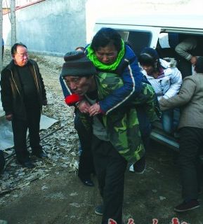 受到驚嚇的李術(shù)貴由村民背回家。