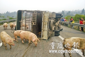 昨日,豬販汪祥全受到處罰。來自市高速公路支隊(duì)的消息稱,近幾年,高速公路上不時出現(xiàn)運(yùn)輸生豬貨車翻車后豬群亂串的狀況,其中曾有100多頭豬在成渝高速路亂串,先后引發(fā)4起車禍、3人受傷,道路封閉4小時。