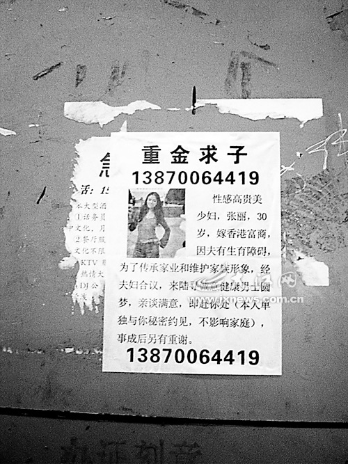 沒費多少時間,記者便在某臨街店面的外墻上看到了這則廣告,內容為“性感高貴美少婦,張麗,30歲,嫁香港富商,因夫有生育障礙,為了傳承家業和維護家族形象,經夫婦合議,來陸尋誠意健康男士圓夢,親談滿意,即赴你處(本人單獨與你秘密約見,不影響家庭),事成后另有重謝”,廣告上還配有一張美女全身照,更是吸引了不少市民的眼球。圍觀市民為此議論紛紛,有的說可能是真的,現如今無奇不有;還有的說,這種事怎么可能廣而告之,肯定是騙子設的圈套。