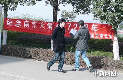 這條印有“紀念南京大屠殺72周年”字樣的條幅為一學生社團所掛;顒迂撠熑死顝娬f,在南京大屠殺72周年來臨之際他們開展了簽名、圖片展、演講比賽等系列活動。他說,用“紀念”這個詞很正常,沒有什么問題。