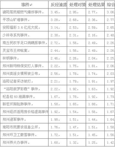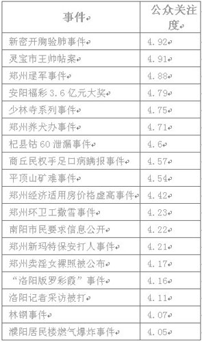 據了解,該報告的自2009年12月14日開始,歷時近一月,共有10078名網友參與打分。報告業示,2009年度發生在河南境內具有較大影響力的18個公共事件,新密開胸驗肺事件和靈寶市王帥帖案名列榜首,而在重大事件的處理上,網民認為濮陽居民樓燃氣爆炸事件,當地政府處理最為得當、及時,受到網民一致好評。