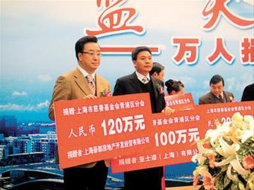 據介紹,青浦此次舉行的“慈善一日捐”活動募得的善款,是該區歷年募捐總額的2.8倍,創歷史新高。在參與捐贈的700余家單位中,景港控股集團捐贈1000萬元;青浦工業園區、上海徐涇建筑工程有限公司、上海豪都房地產開發經營有限公司等18家單位捐贈了100萬元以上。(談燕)