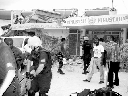 海地時間1月12日下午4時50分,太子港發(fā)生地震時,于江樺和在太子港工作的中國同事劉昆開車前往聯(lián)海團總部大樓接一位美國同事。車子在大樓前還沒停穩(wěn),大家就覺得車子在晃,一樓已經(jīng)冒出大量白色灰塵并伴隨著轟鳴聲,于江樺和劉昆下車后趕緊向遠離大樓的地方跑。由于地面在震顫,根本無法站立,倆人只好蹲下等地震停止。大約30秒鐘后,于江樺和劉昆轉(zhuǎn)過頭來,看到聯(lián)海團總部大樓已經(jīng)完全坍塌。于江樺連忙掏出手機撥打隊長趙化宇的手機,但此時信號已經(jīng)中斷。這時防暴隊長說:“我們的代表團正在樓里開會。”聽到這個消息后,于江樺的頭一下子就蒙了。