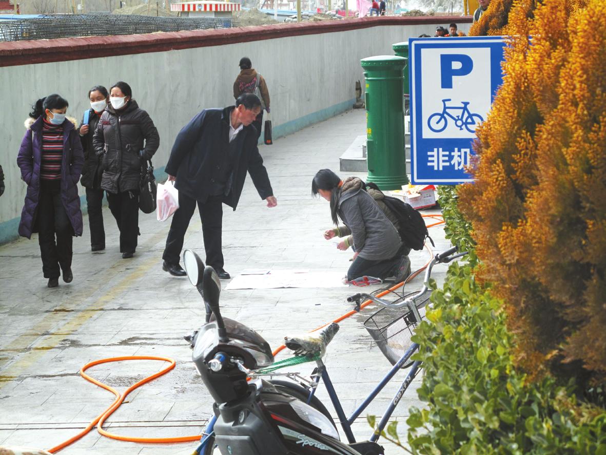 然而,當其中一個女孩看到記者正在遠處掏出相機拍照時,顧不得接過市民遞過來的錢,連忙用手遮著臉,拉著另一個女孩迅速站起來收拾東西,然后飛快地離開了現場。
