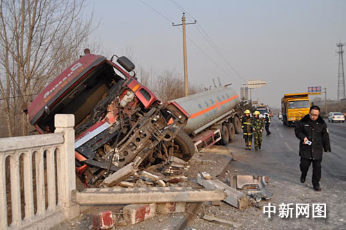 中新網(wǎng)洛陽1月27日電 (記者 李金輝 通訊員 王力)1月26日下午15時(shí)許,在洛陽市新安縣310國道磁澗鎮(zhèn)磁澗橋上,一輛滿載30噸氫氧化鈉的槽車不慎側(cè)翻,發(fā)生嚴(yán)重泄漏,周圍居民的生命安全受到極大威脅。