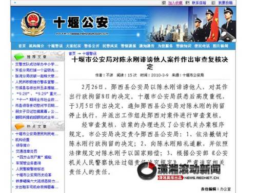今日零點(3月10日),瀟湘晨報滾動新聞記者在湖北省十堰市公安局官方網站上發現一則通告,稱經復核,撤銷撤銷對陳永剛的拘留決定,并向陳賠禮道歉、國家賠償,同時追究相關責任認責任。