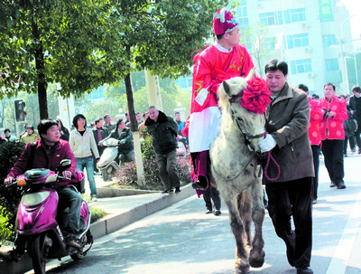 新郎周先生和新娘肖小姐都是80后人,對于中國古典文化頗為癡迷。在勾勒自己的婚禮時,在國外留學多年的肖小姐希望能像中國古典小說中描述的一樣,新郎騎馬前導,新娘花轎及嫁妝后隨,鑼鼓鞭炮迎至男家。