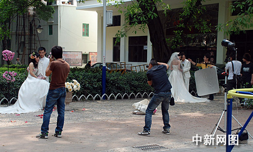 中新網廣州3月29日電 題:沙面取景難度大 婚紗攝影師忙“占位”