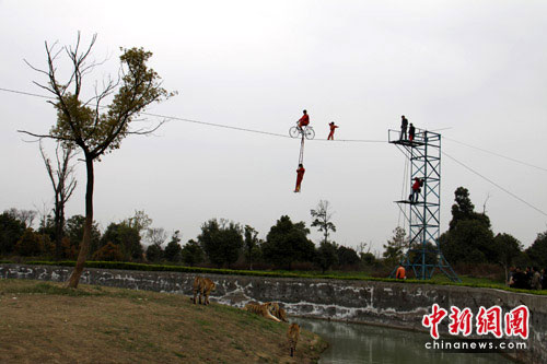 此次挑戰地點設在常州淹城野生動物世界自駕區虎園,挑戰者“小燕子”要在虎園內6只東北虎上空架起的130米長的鋼絲上空空手行走,此鋼絲距地面老虎還不到9米,更讓人為她捏汗的是,她的安全防護措施僅僅是一條細細的繩索。