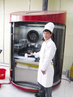 記者昨日在現(xiàn)場看到,“愛可2.0”高約2米,寬約1.8米,有拉門封閉,里面有特制的烹飪設備,有鍋,有自動噴油、噴水、攪拌設備,與之相連接的是一個智能化觸摸屏,上面是系統(tǒng)控制界面。在正式烹飪前,早已“定量”好的主料、配料和作料都被放在專用盒子里。工作人員將“杭椒牛柳”的材料送入“愛可2.0”,在觸摸屏輸入程序,機器人開始工作。