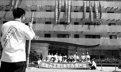 昨天上午,數(shù)十業(yè)主統(tǒng)一著裝聚在公寓大門前,并在樓前掛出橫幅,聲討開發(fā)商不給房產(chǎn)證等惡劣行徑。多名業(yè)主表示,他們是近幾年來陸續(xù)入住該公寓的,但都未獲得房產(chǎn)證,拉橫幅集體抗議實(shí)屬無奈。記者多次聯(lián)系開發(fā)商一方,均被告知不便回答或拒絕采訪。