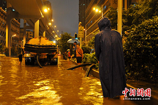 在“水浸黑點”之一中山一路現場,有多位環衛工人被臨時抽調過來協助排水,其中一位工作人員黃叔對筆者說:“雨下的這么大,市政也沒有辦法,只能派抽水車過來協助排水,已經來回好幾趟了,但是還沒能那么快抽完。這水還不知道什么時候才能退。”“我們是臨時抽調過來協助排水的,已經加班了好幾個小時了。”黃叔一臉無奈的說。
