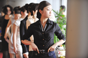 候場(chǎng)區(qū),美女云集的地方,只要一個(gè)轉(zhuǎn)身,你就可以看見(jiàn)近千名佳麗有的在偷偷補(bǔ)妝,有的對(duì)著鏡子練習(xí)微笑。在等候面試的美女中,有帶著綠色美瞳的美國(guó)加州留學(xué)生,有穿背帶褲剛剛高中畢業(yè)的學(xué)生,還有身著職業(yè)裝想換個(gè)工作的公司白領(lǐng)。“現(xiàn)在工作不好找,所以只要有招聘就來(lái)試試咯。”這是記者在現(xiàn)場(chǎng)聽(tīng)到最多的一句話(huà)。