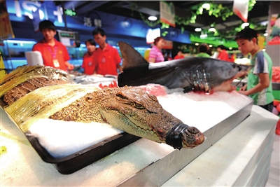昨天,記者提出看超市出售鱷魚的相關證明,永輝超市的前臺負責人劉先生稱,超市從農貿市場購進了鱷魚和鯊魚,對方都提供了檢疫報告和許可證,“賣方提供相關證明,我們就能進貨公開銷售,超市不需要提供證明”。 (記者王奕)