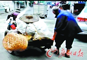 在穿梭的車流中,陳老伯弓著腰,吃力地拉著歪歪扭扭的平板車在大馬路上緩慢前行,車輛在他身邊飛馳而過,老人究竟要去哪里呀?“我要拉去清新縣逕口,要走3個小時啊,”從老伯含糊不清的言語中,記者得知,原來這對年齡加起來160歲的老夫妻每天凌晨3時多就要起身,從20多公里外的城郊拉車徒步進城,到了市場已經天亮,接著他們分頭去揀一些爛菜葉等裝好車,再一路拉回去喂豬,到了家里已是月上梢頭。一個8旬老伯拉著平板車從松崗市場去清新逕口,就算是一個正常人行路,也要走幾個小時,別說是拉車了。陳伯的舉動吸引了不少人的好奇的目光,他為何要這樣折磨自己啊?