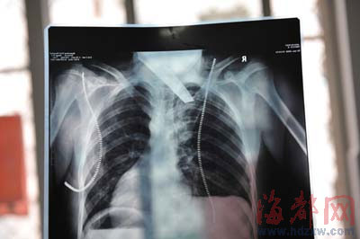 前晚,在第一醫院急救室,經過4個多小時的搶救,醫生將匕首從小勇身上取出,發現這把匕首的刀尖扎斷了1厘米。由于小勇肺部被刺中,昨天上午,醫生再次進行了3個多小時的手術,切除了受傷的部分肺,直到下午,小勇才挺過來!巴α艘灰梗F在總算醒了過來!睏钆恳灰箾]睡,守在手術室外7個多小時,生怕兒子再醒不過來。不過,由于傷勢嚴重,小勇目前戴著氧氣呼吸,仍未脫險。