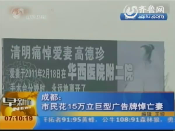成都:市民花15萬立巨型廣告牌悼亡妻