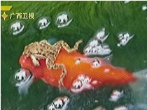 懶惰青蛙“騎”在金魚身上游池塘