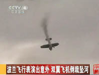 波蘭飛行表演出意外 雙翼飛機(jī)倒栽墜河