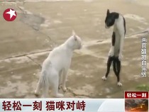 兩貓咪對峙 白貓威武黑貓被嚇站立