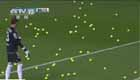 西甲球迷發泄不滿 足球賽場狂扔網球