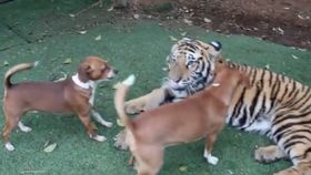 狗狗和老虎居然玩到一起