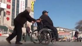 佝僂瘸腿老太推著老伴看戲