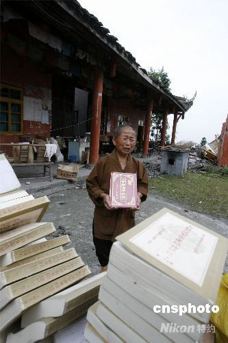 圖:尼姑從垮塌的大殿中搶救出的經書