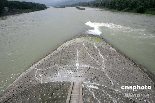 圖:四川都江堰魚嘴分水堤震后出現裂縫