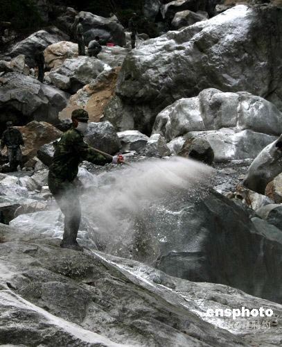 圖:解放軍在藏寨廢墟中搶救珍貴文物