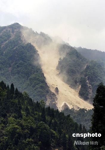 圖:山體滑坡煙塵籠罩下的汶川縣城