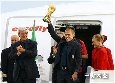 飛機降落后,駕駛員將一面意大利國旗探出了駕駛艙,隨后,機艙門打開,意大利隊隊長卡納瓦羅手捧大力神杯,和主教練里皮一道走下飛機,出現在了現場數千名球迷面前,面對記者,里皮激動地說:“我不清楚我們是在第七層天堂,還是在第六層天堂,但是現在,我們真的是非常高興。”談到國內的足球丑聞時,他表示:“就算時間不長,但我們也要高興一陣子。”為了迎接世界冠軍的歸來,意大利空軍特技隊也進行了精彩表演,飛機噴出了紅白綠三色煙霧,這代表著意大利國旗的顏色。