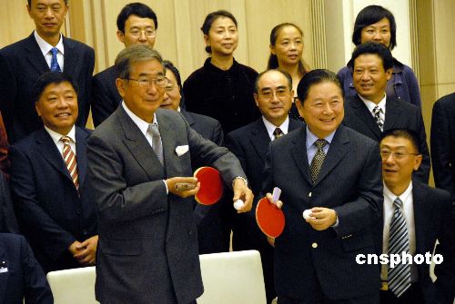 10月26日下午,東京都知事石原慎太郎在東京市政大廈會見正在日本訪問的中國乒協(xié)主席徐寅生及其訪日團一行20人。徐寅生一行應日本乒協(xié)的邀請10月25日抵達東京開始對日本進行一周訪問,代表團成員包括莊則棟、曹燕華等10多名國手。石原慎太郎說,在日中邦交正常化35周年之際,在東京見到中國的著名乒乓選手非常榮幸。石原希望中國支持東京申辦2016年夏季奧運會,通過體育交流促進中日關系。中新社發(fā) 段躍中 攝