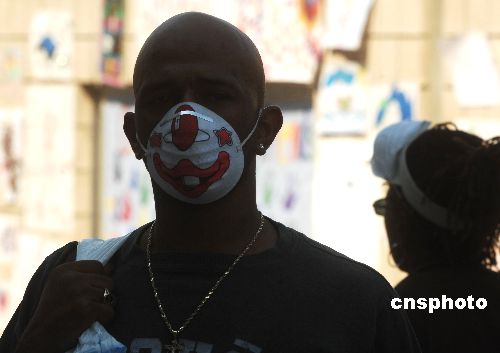 美國南加州大火十月二十八日主要在圣地亞哥山區(qū)已控制住,但官方估計至今還有一萬二千戶家庭受到火災(zāi)威脅。圖為圣地亞哥民眾因空氣煙塵污染都戴上口罩上街。中新社發(fā) 賈國榮 攝