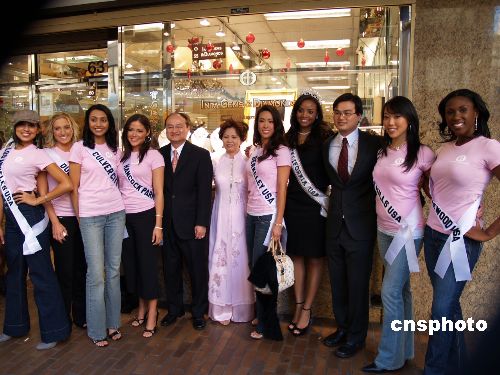11月24日,全美華埠小姐徐仁惠與參選美國小姐的90位佳麗一起在洛杉磯走訪唐人街的華人珠寶商,并現場展現美貌和智慧。中新社發 盧威 攝