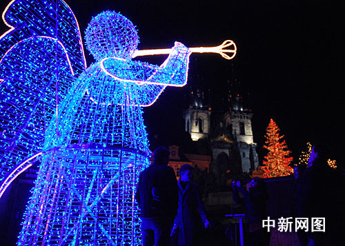 當地時間12月1日,捷克首都布拉格老場廣場舉行傳統的圣誕燈火亮燈和圣誕集市開張儀式。在大約12000名游客的歡呼聲中,布拉格市長貝姆啟動開關,胡斯塑像旁邊22米高的圣誕樹由下到上開始放射出燦爛光芒。今年新增的矗立在集市四角的4座長著翅膀吹號的天使燈火塑像讓游客們特別感興趣。黃頻 攝
