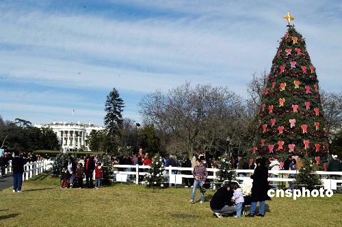 當?shù)貢r間12月24日,在圣誕節(jié)平安夜前,白宮門前巨大的圣誕樹吸引了眾多前來參觀的游人。一九二三年平安夜起,白宮前第一夫人格蕾絲就倡導在白宮門前每年插上圣誕樹,并命名為“國家圣誕樹”,到一九七三年,當時的白宮主人為了保護森林,下令停止每年砍伐樹木做圣誕樹,叫人種植了一棵巨大的圣誕樹,美國五十個州還送來小圣誕樹樹種在周圍,以便游人觀賞。中新社發(fā) 邱江波 攝