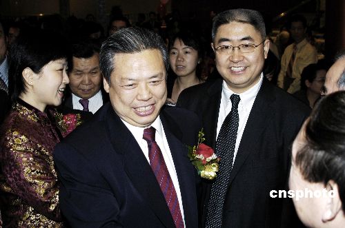 當地時間一月十日晚,美國紐約華人社團聯席會屬下二十七個僑團的五百多名僑界代表在紐約第二大中國城皇后區法拉盛舉辦隆重晚宴,歡迎中國駐紐約總領事館總領事彭克玉履新。圖為晚宴上彭克玉(中)與夫人楊京梅(左)在紐約華人社團聯席會主席謝剛(右)的陪同下與熱情的華僑代表會面。中新社發 鄧悅 攝